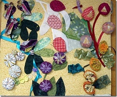 I’m not ready to applique the flowers onto my base fabric yet, but for this one I tacked the edges under so we can see the finished shape.