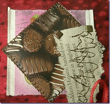 There’s another one of those tea packets. This time I cut an insert from a Russell Stover’s box and stitched it on top. The newspaper is a fragment from the same page as above, with two more of the square brads.